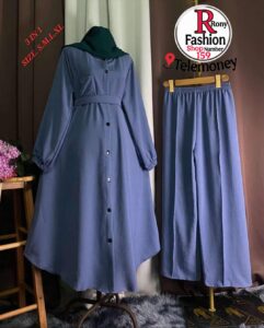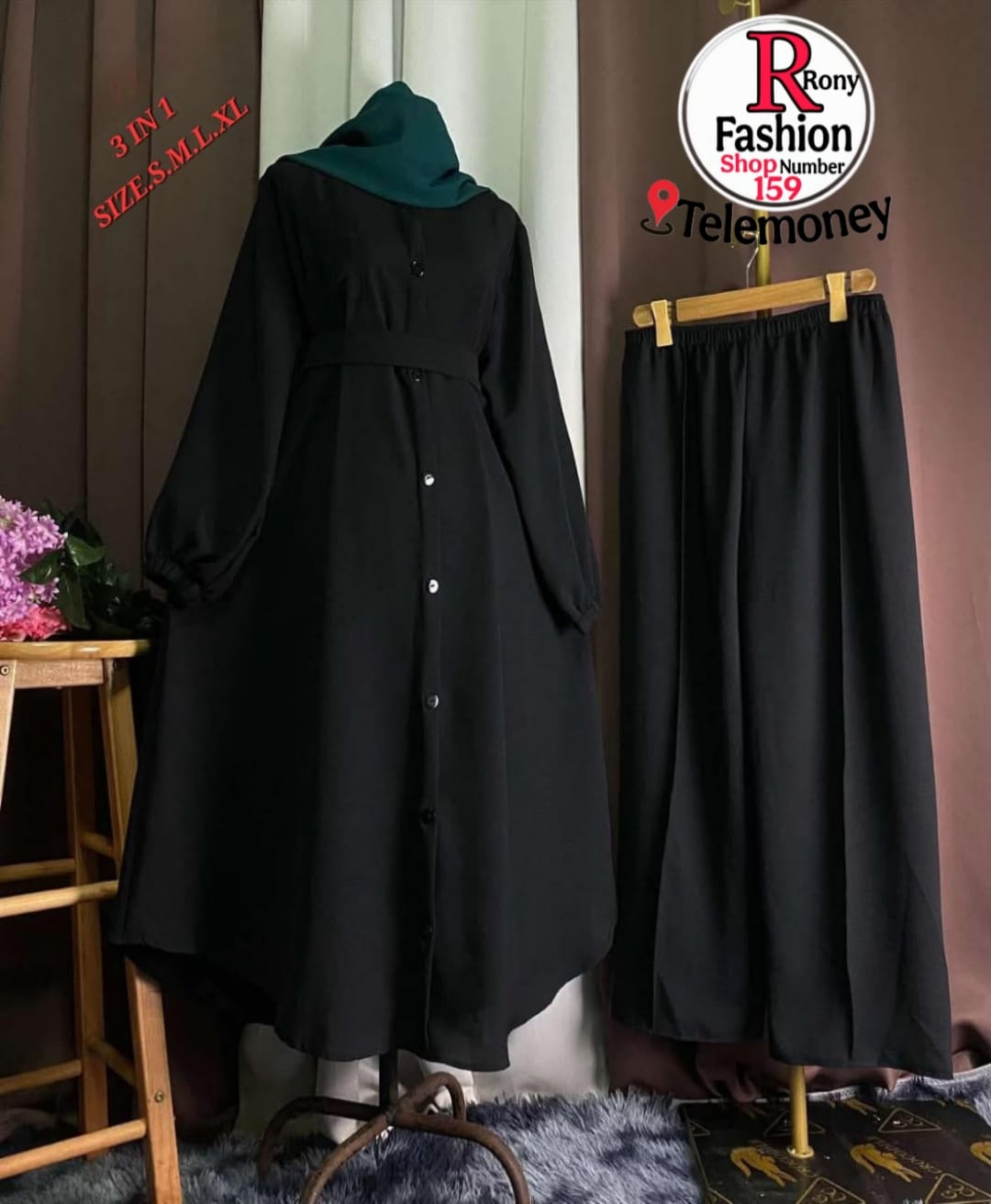 • Complete Set: Includes 1 Long Button-Down Tunic/Abaya, 1 Matching Wide-Leg Trouser, and 1 Complementary Hijab.