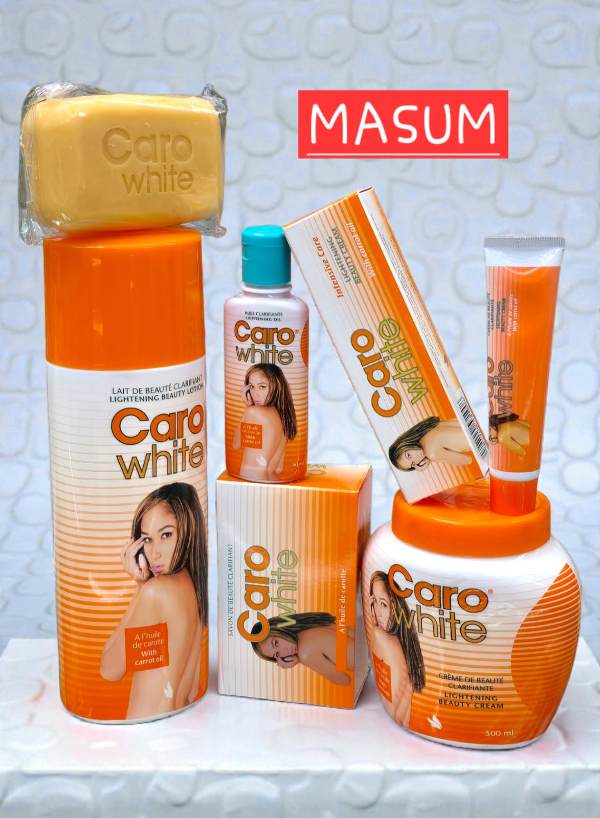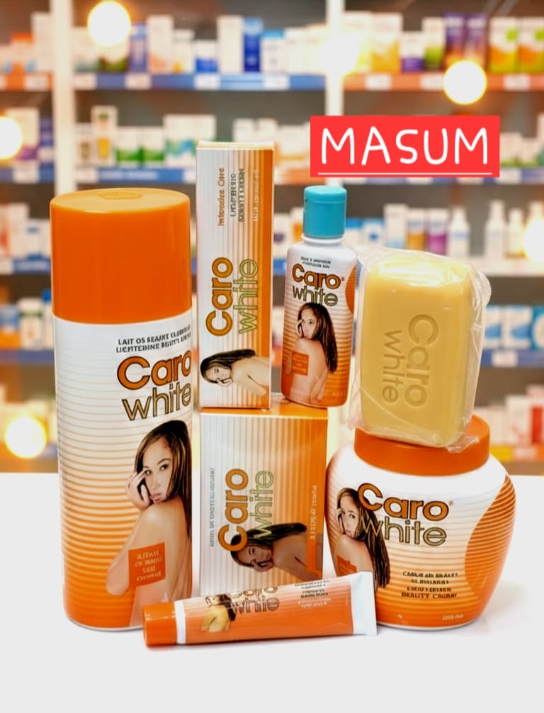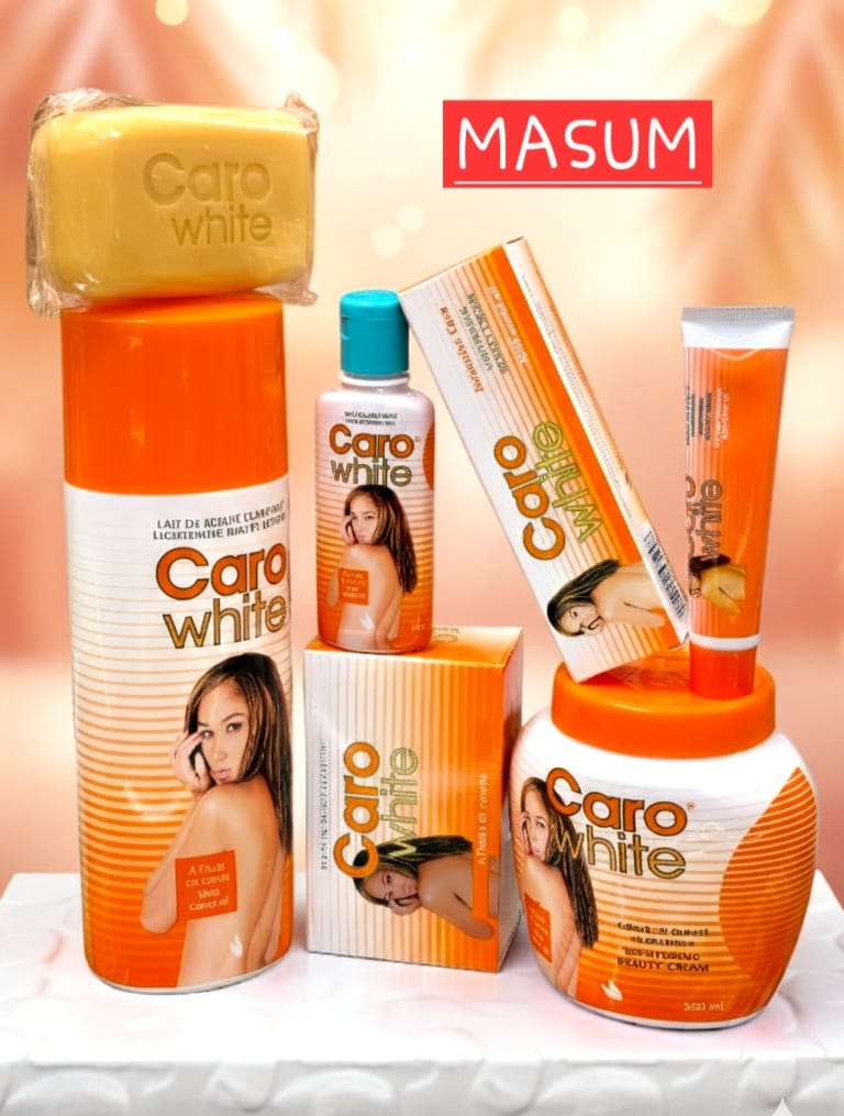 This image displays a range of Caro White skin lightening products.