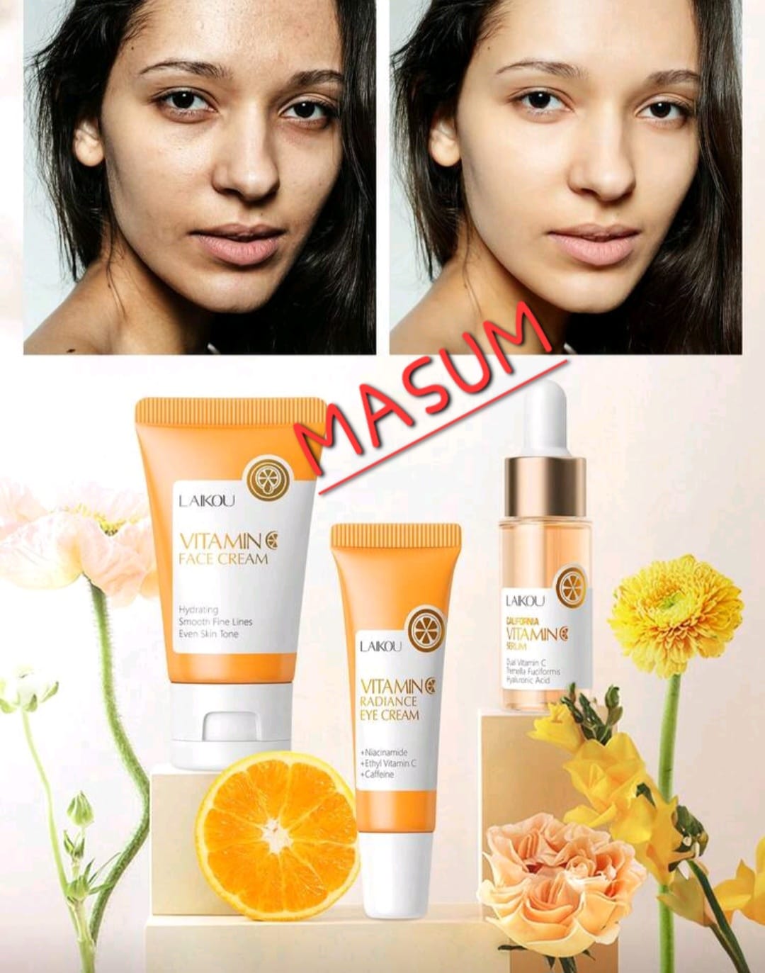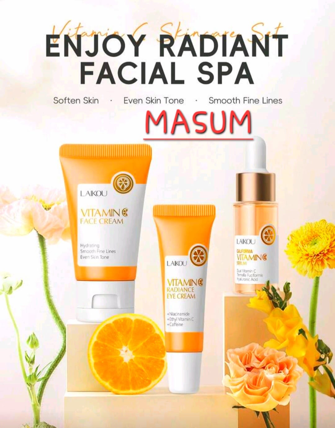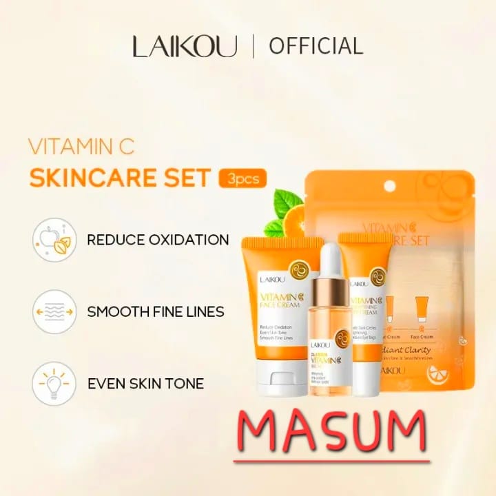 LAIKOU Vitamin C 3-Piece Facial Spa Set – Brightening Face Cream, Eye Cream, & Serum