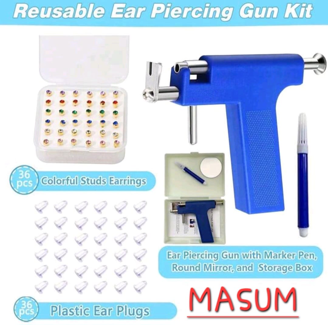 The image displays a MASUM ear piercing gun kit with a stud and mirror.
