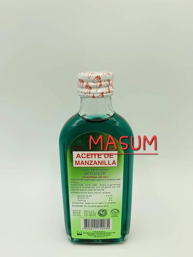 This is a bottle of IPI Aceite de Manzanilla (Chamomile Oil). This antiflatulent oil is used to help relieve gastrointestinal discomfort such as gas and bloating.